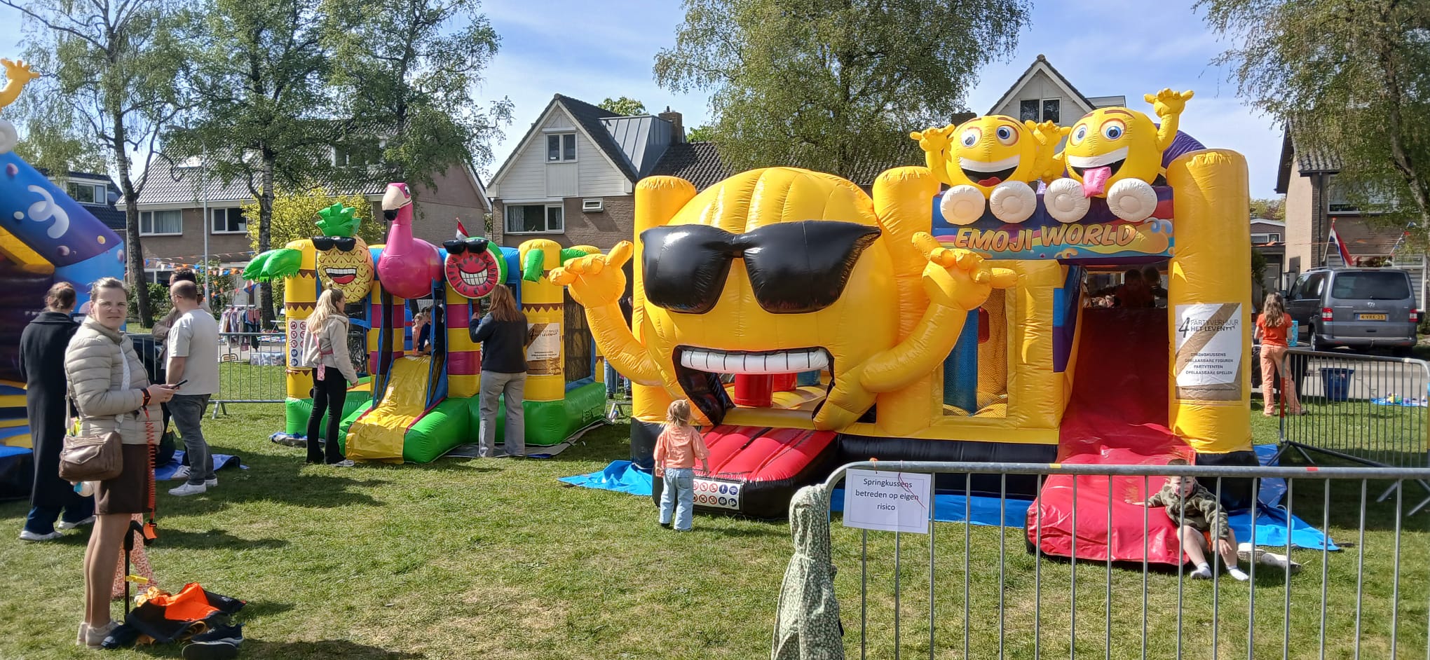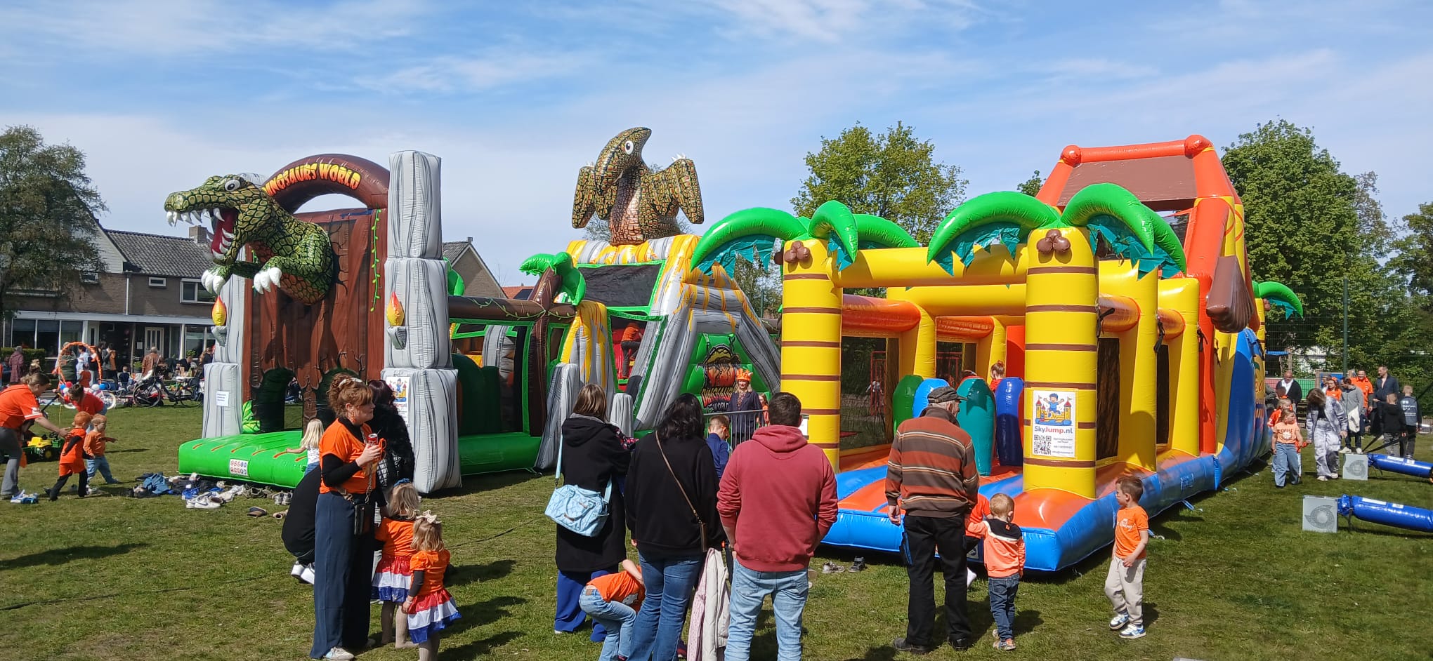 Op 't Harde is een veld omgetoverd tot een fantastische speelplek voor kinderen. Het staat er vol met opblaasbare springkussens en stormbanen.