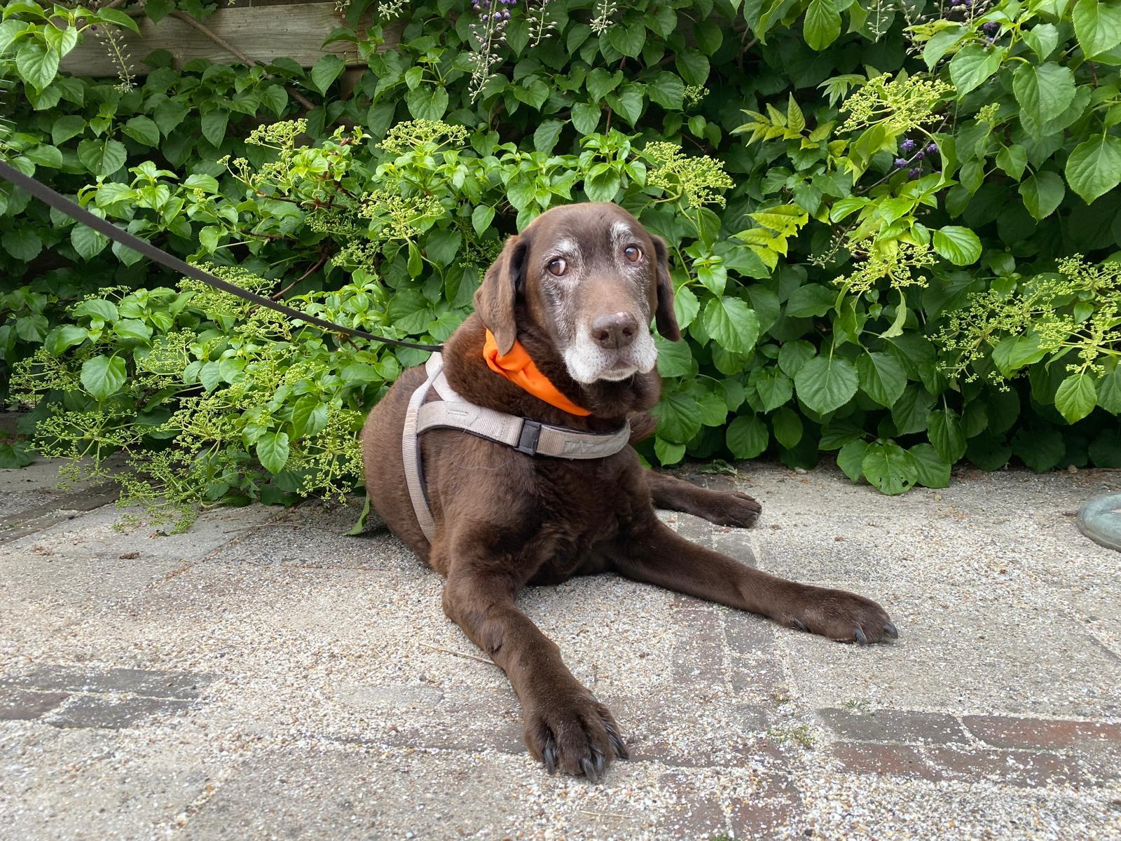 Max uit Voorthuizen viert dit jaar zijn 16e(!) Koningsdag. Speciaal daarvoor heeft hij van zijn baasje een oranje halsband gekregen.