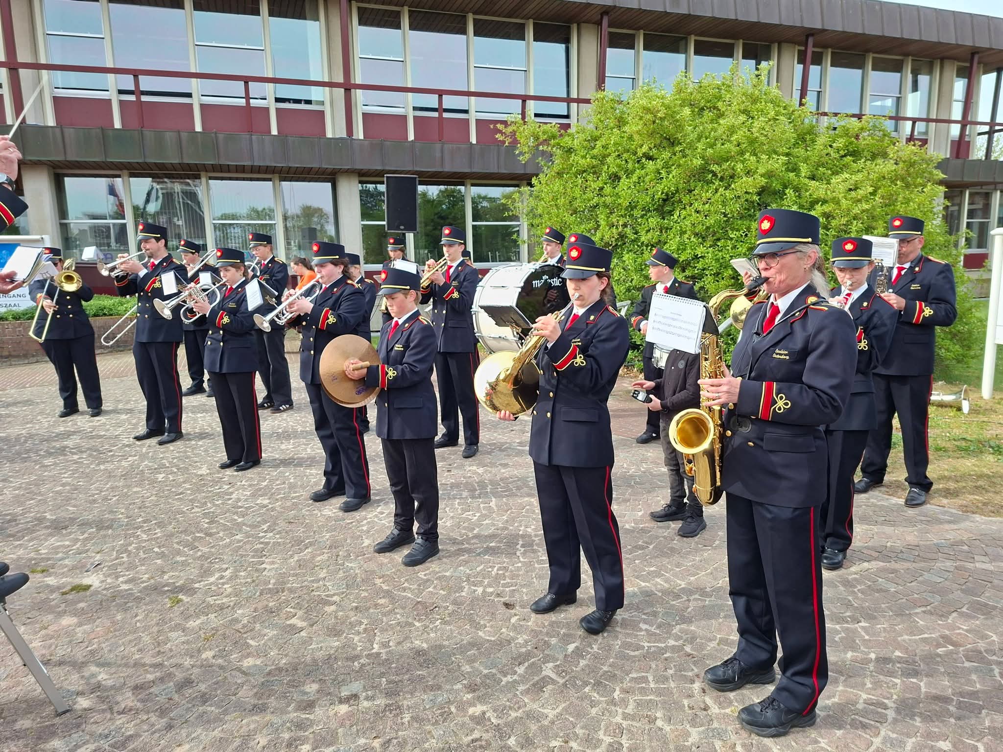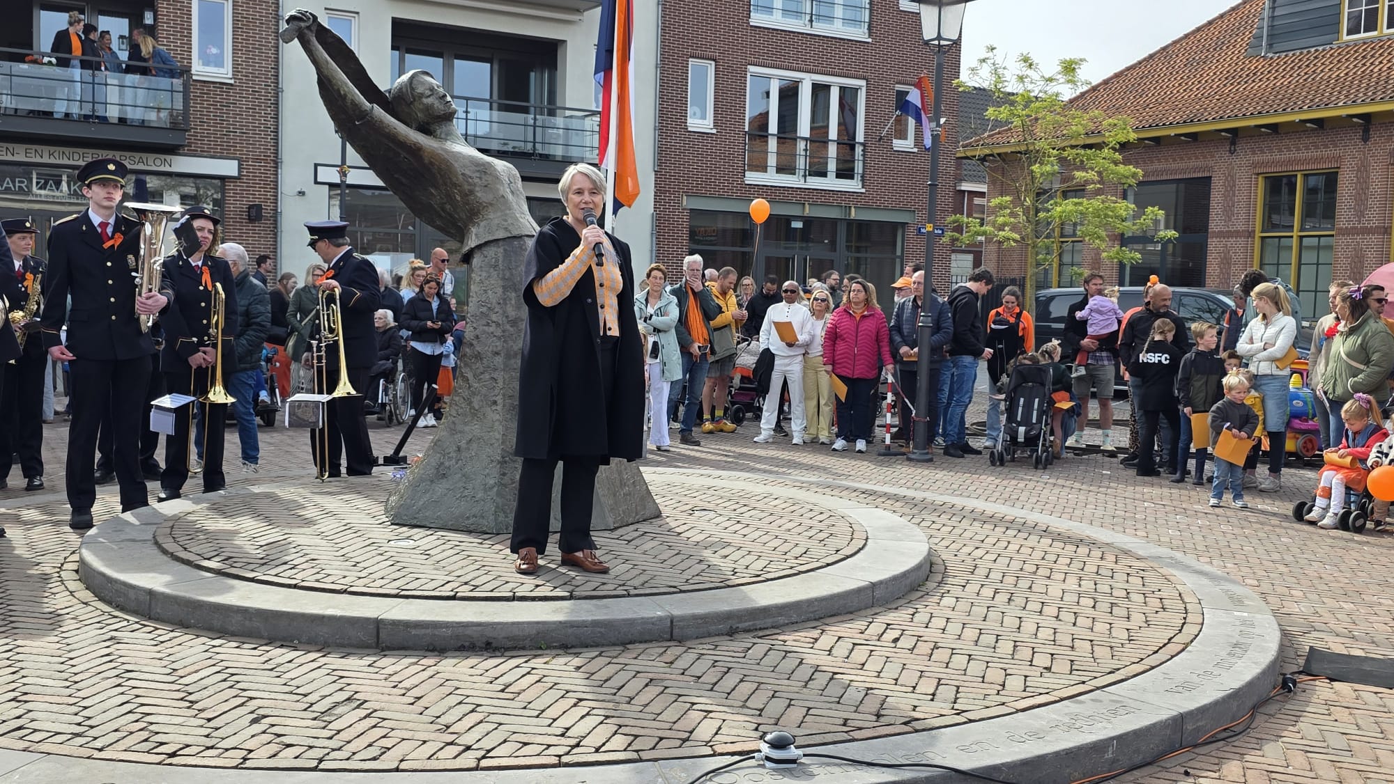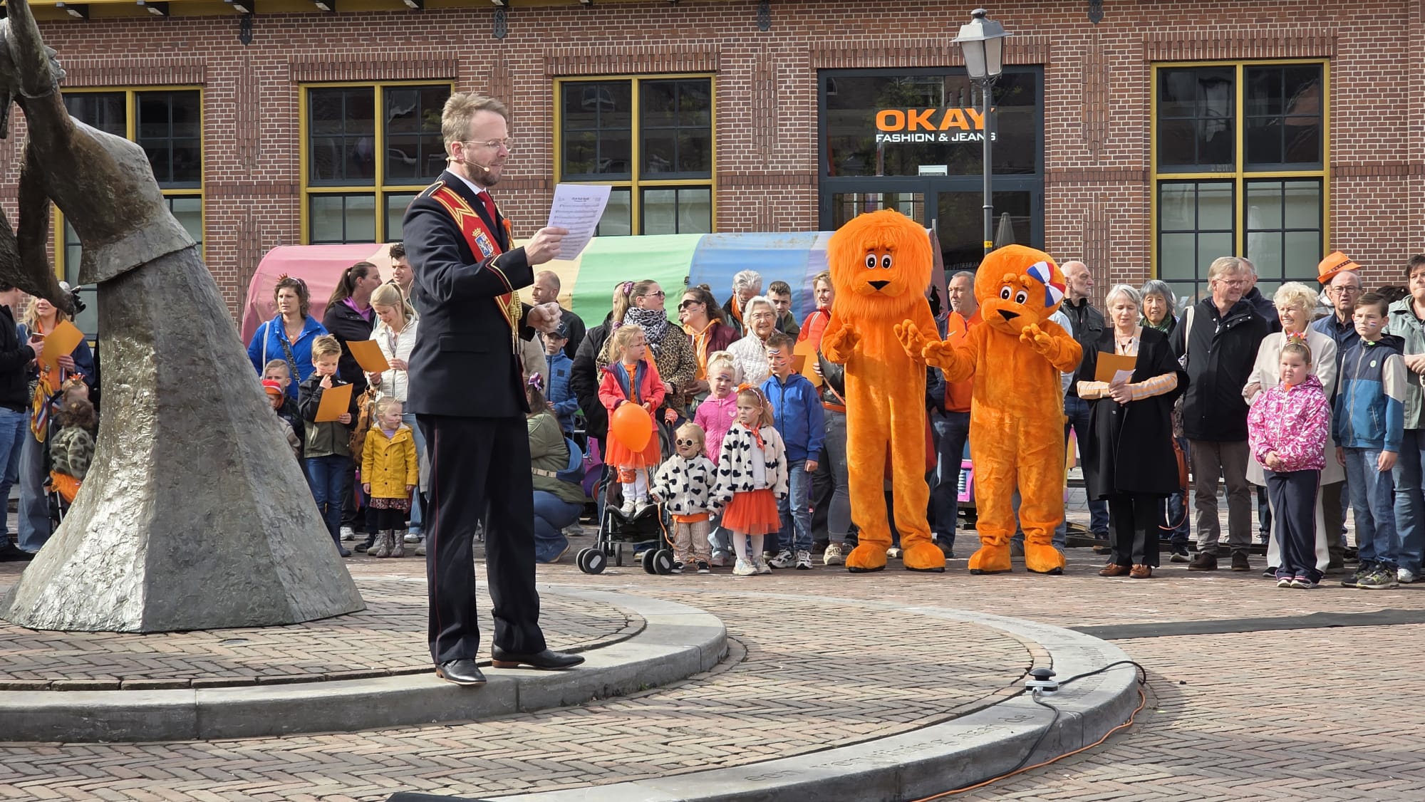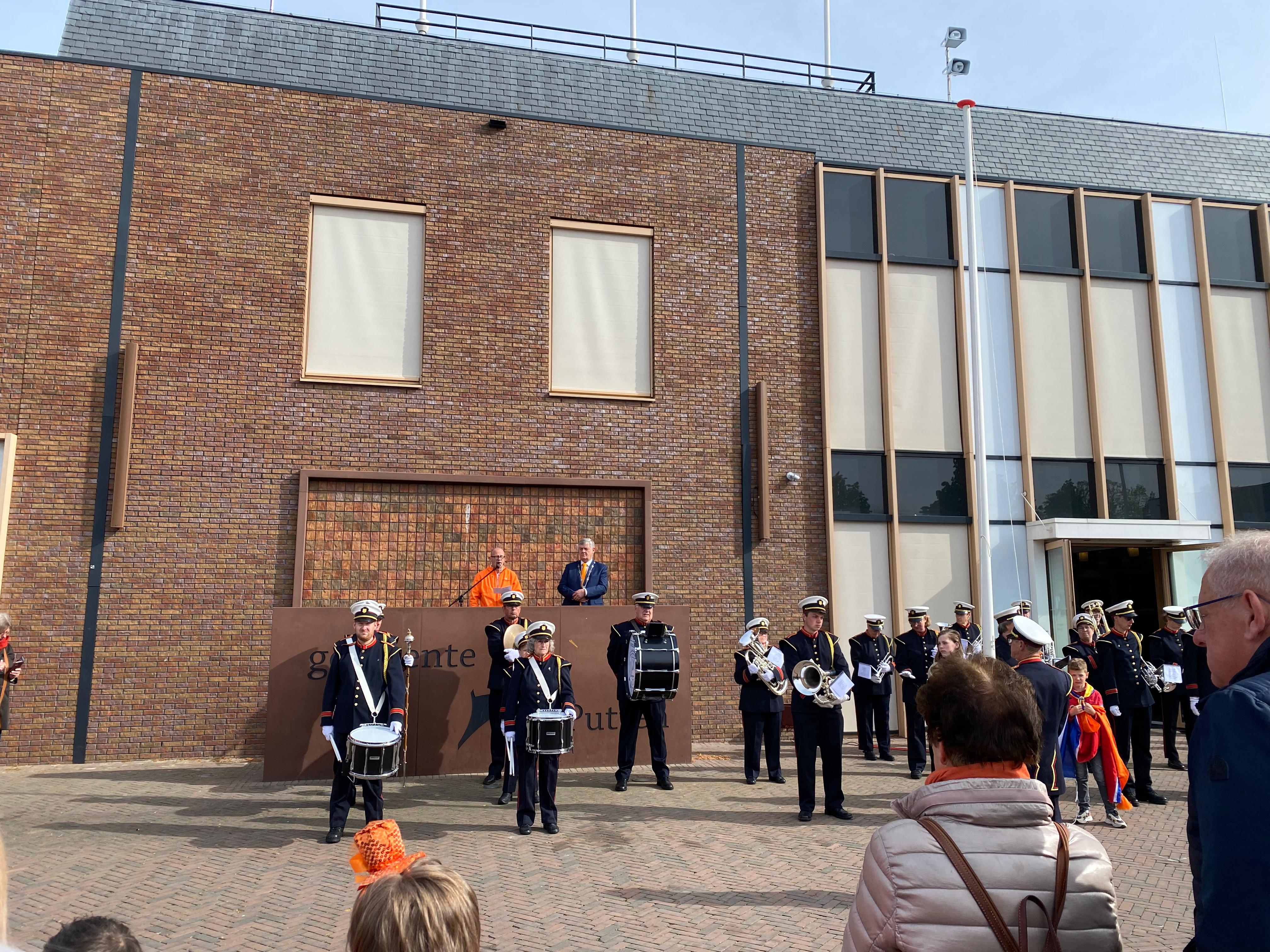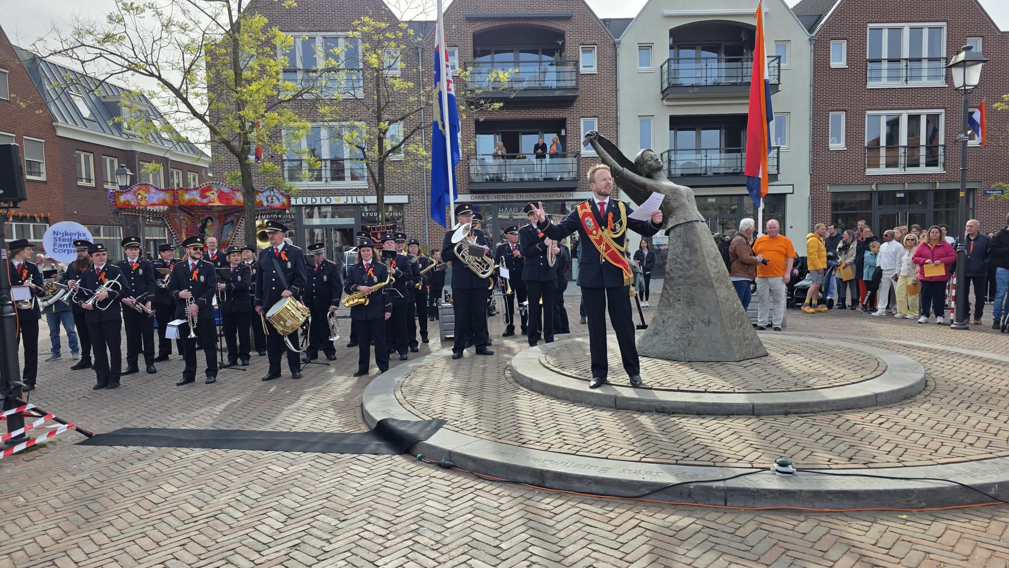 Op het Molenplein vond zojuist de Aubade plaats onder leiding van het Nijkerks Stedelijk Fanfarecorps. Ook aanwezig zijn locoburgemeester Mariëlle Broekman en de mascottes Alex en Maxine de Leeuw