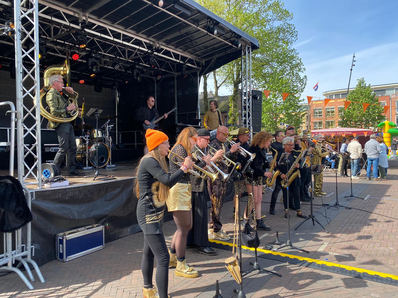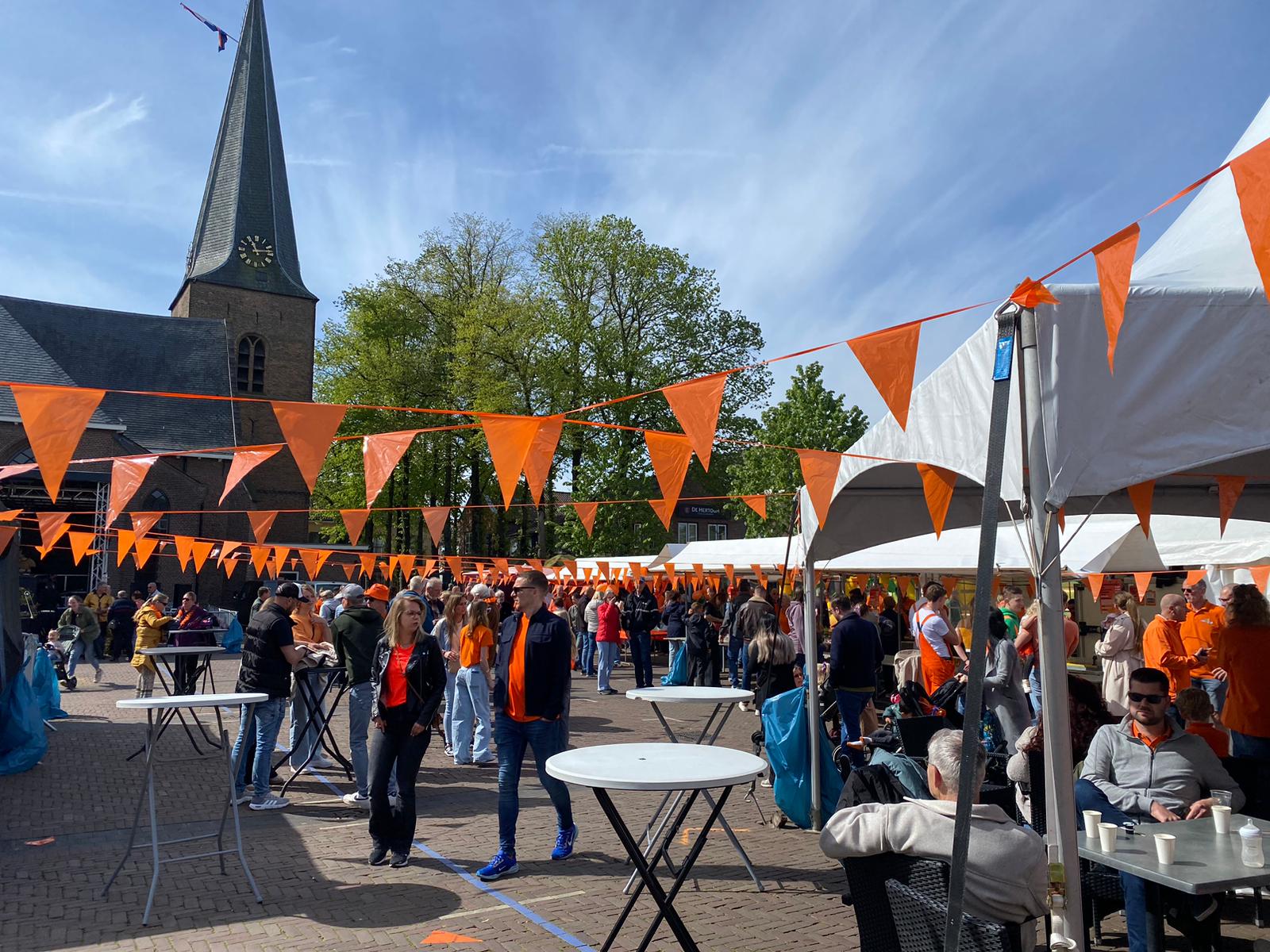 Het plein in Putten is ook in Koningsdagsfeer. Met veel oranje vlaggetjes, muziek en opvallende oranje outfits.