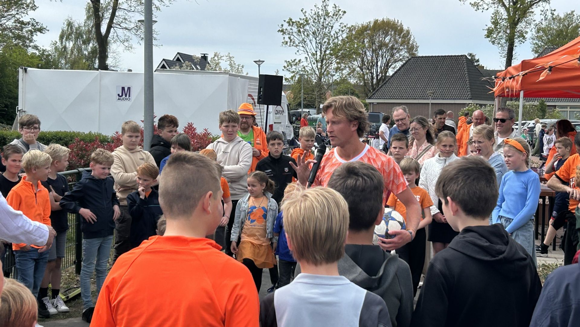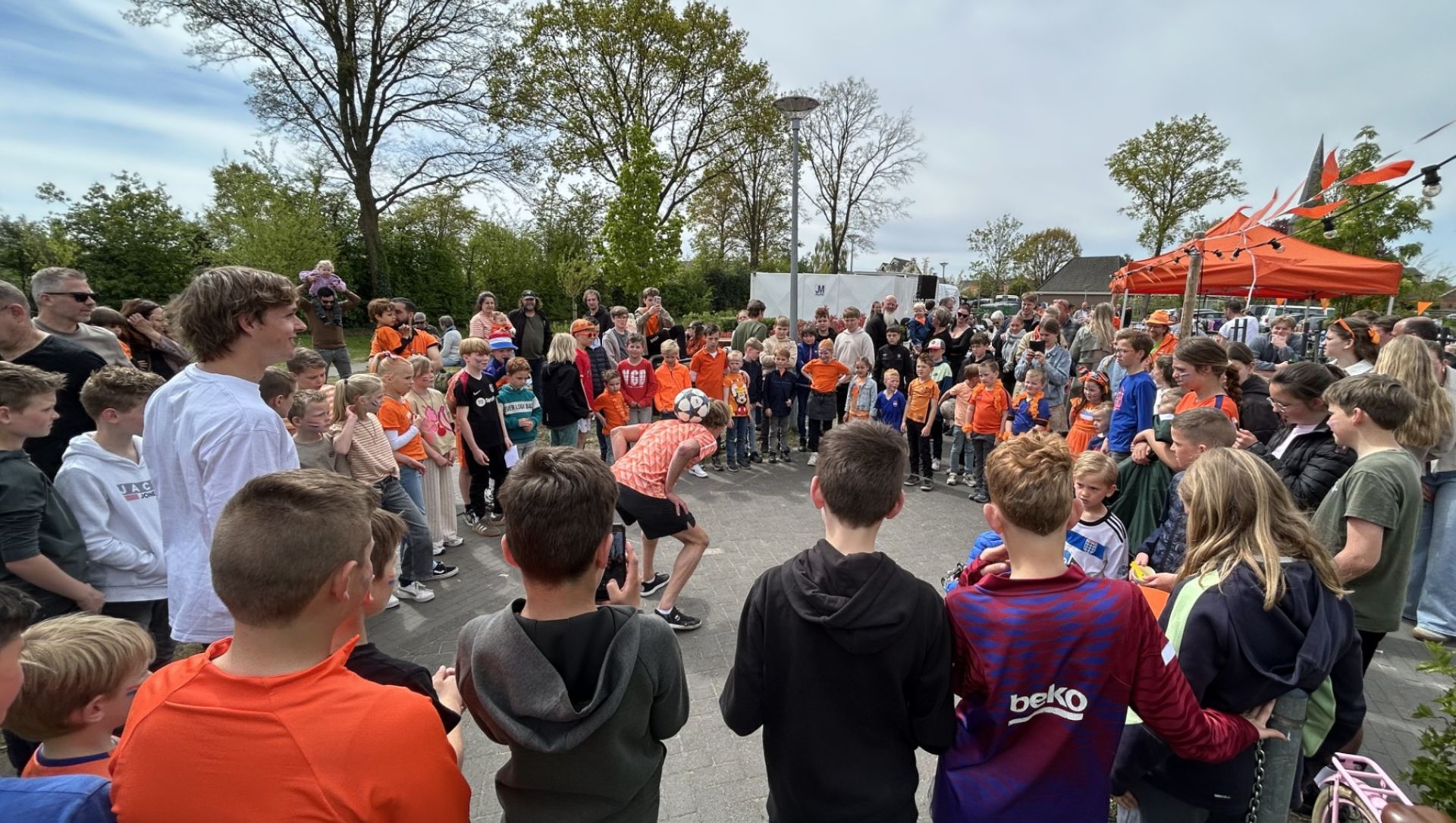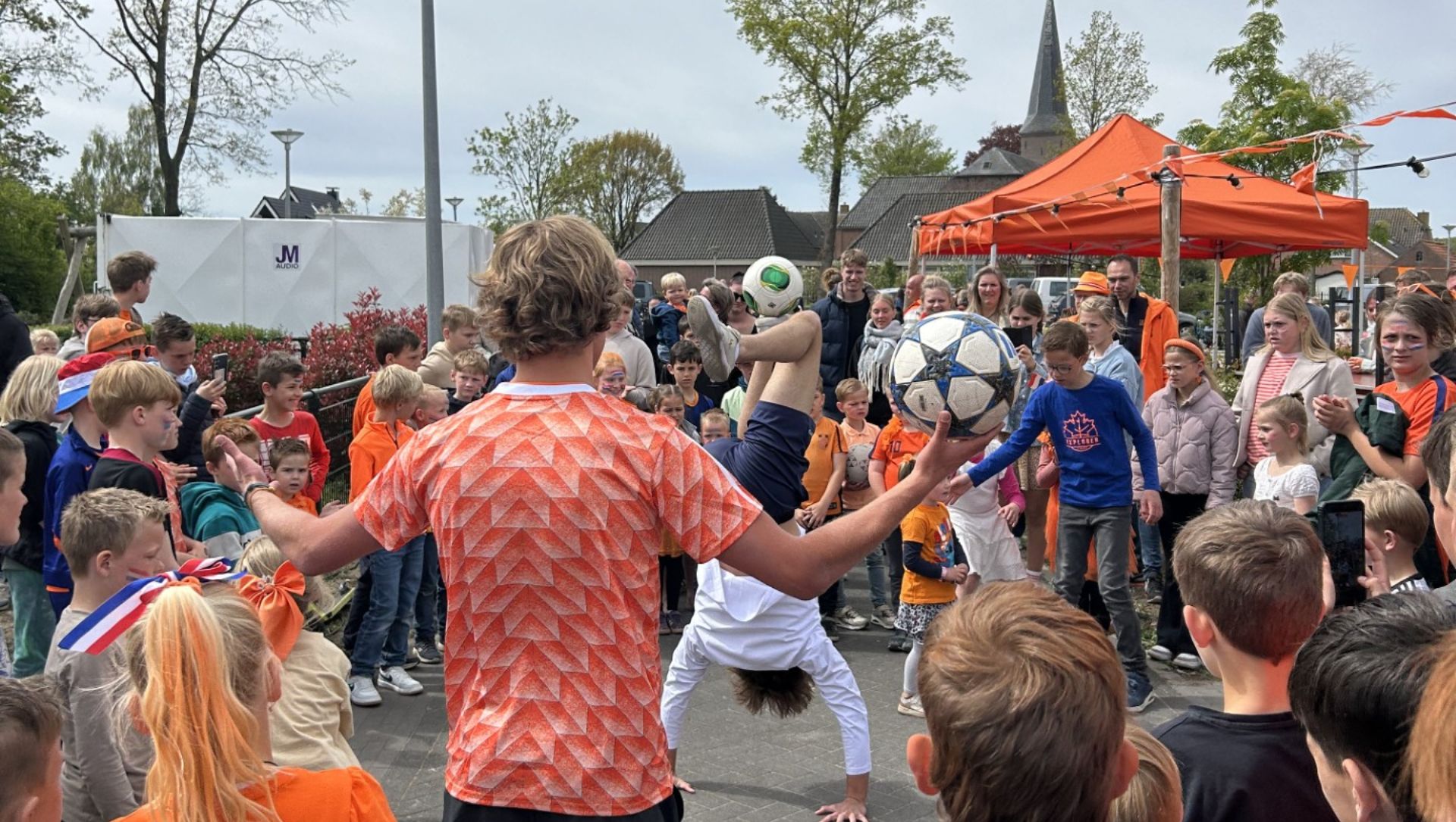 Trucs, balgevoel en veel bekijks: in Oosterwolde geeft Bodhi Bos, bekend van Holland’s Got Talent, een show en workshop freestyle voetbal. De kinderen kijken aandachtig toe en mogen daarna ook zelf meedoen. Vooral de backflip blijkt nog een stunt die wat extra oefening vraagt, al hadden de kinderen die truc graag uitgevoerd zien worden.